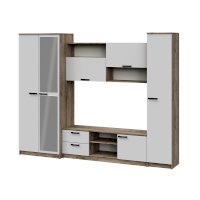 - Гостиная состоит из трёх модулей (шкаф платяной, шкаф бельевой, средняя секция), которые при желании можно устанавливать отдельно друг от друга, размещая в разных комнатах