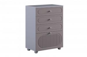 Корпус комода выполнен из ЛДСП толщиной 16 мм, фасады изготовлены из МДФ в плёнке ПВХ. Фасады с фрезеровкой подчёркивают аккуратный внешний вид изделия. Оригинальные круглые ручки и опоры придают комоду современный и лёгкий характер, делая его гармоничной частью детского интерьера.